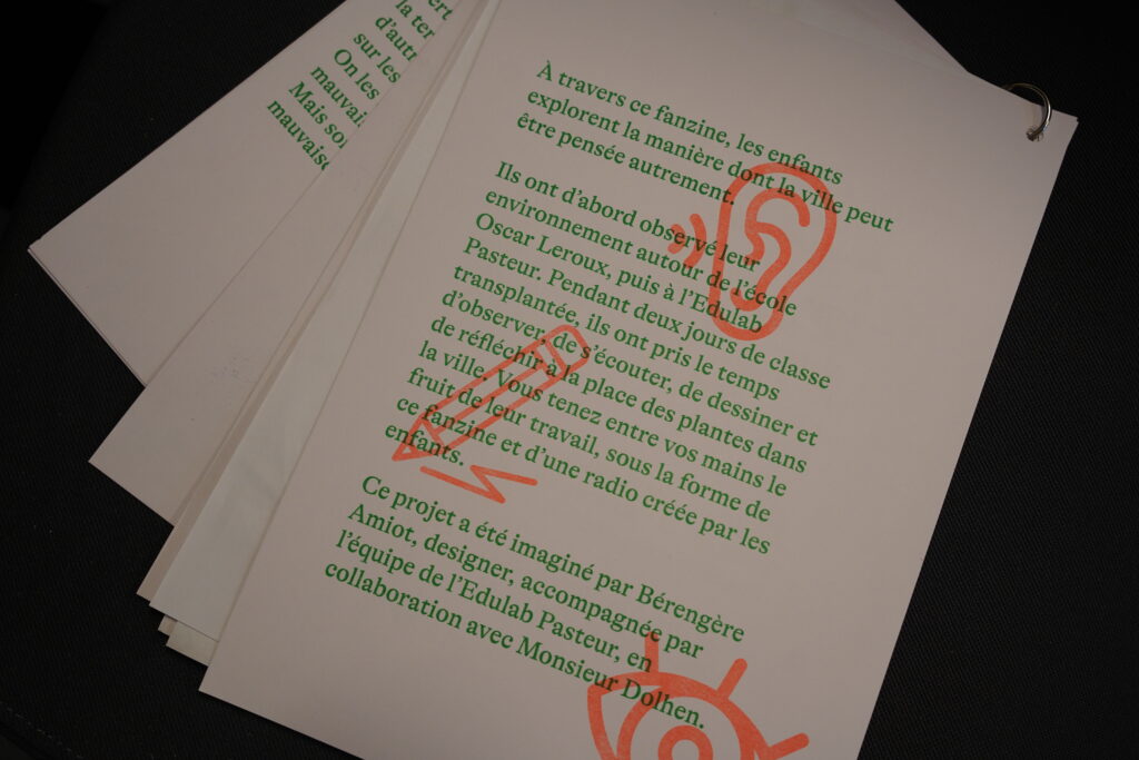 De cette expérience collective est né un fanzine imprimé en risographie avec les enfants : un objet fabriqué de leurs mains, qui porte leurs regards, leurs questions et leurs imaginaires. Il est accompagné de podcasts et d’une radio entièrement créés par eux, donnant ainsi une voix sonore à leur exploration du territoire.